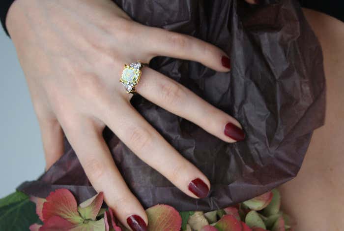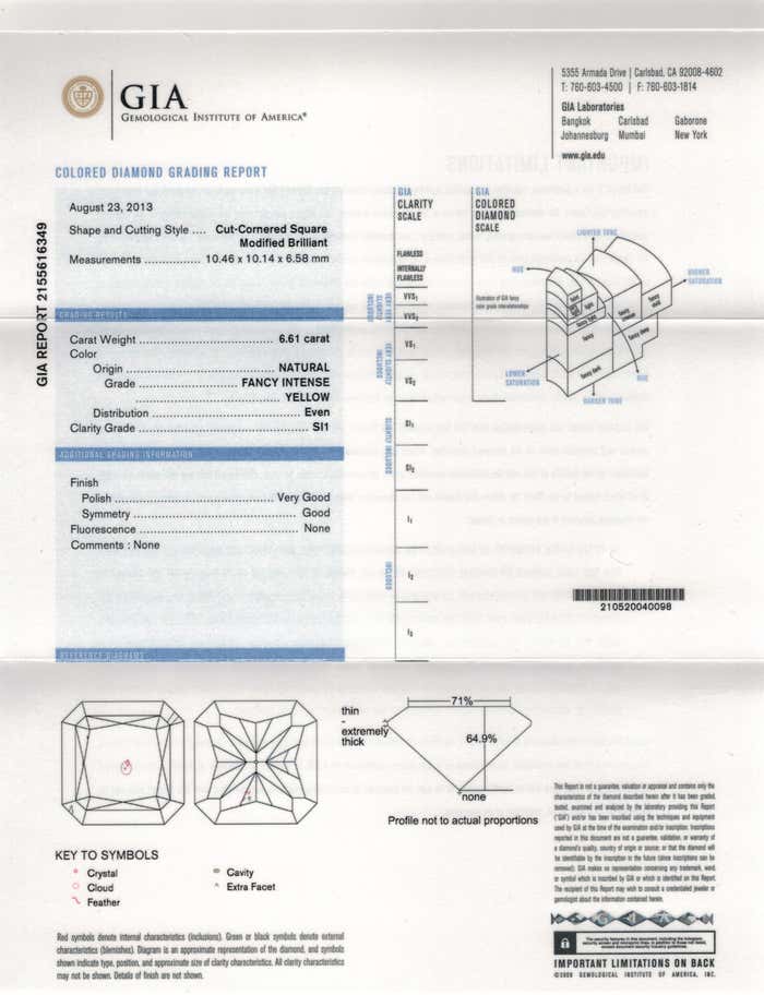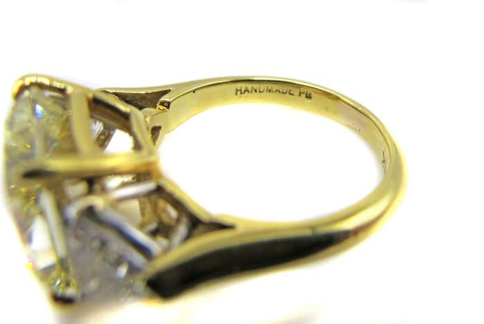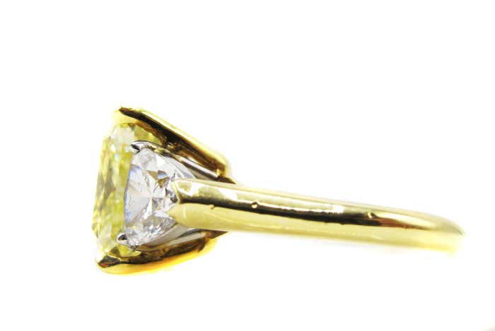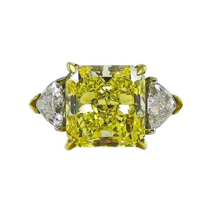 Amazing lemon yellow natural fancy intense yellow diamond ring set in an 18 karat yellow gold and platinum superbly hand crafted mounting. The extremely well-cut radiant has an extraordinary spread, looking larger than stones the same size. This diamond exhibits an incredible brilliance and color saturation.The center diamond weighing 6.61 carats is flanked by 2 lively trillion cut diamonds measured to weigh approximately 0.60 carats each. The intense yellow is accompanied by a GIA certificate. The ring size is 5.5 and can be sized. - GIA 6.61ct natural fancy intense yellow radiant cut diamond - 2 trillion cut diamond weighting approx. 0.60cts each - Size 5.5, sizable - 7.4 grams - 4.7 dwt