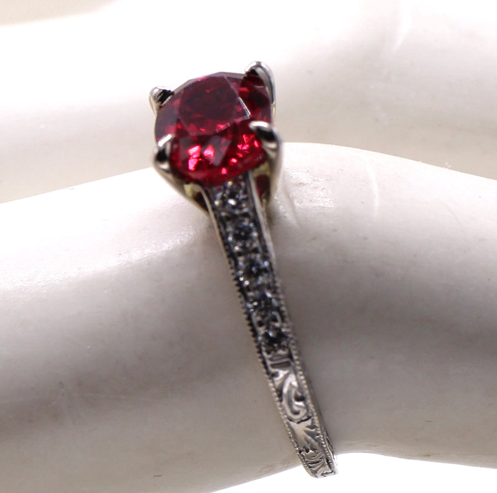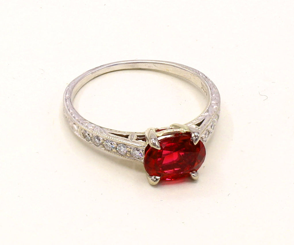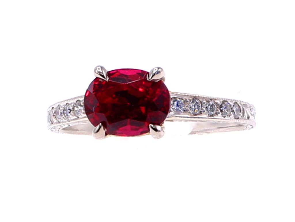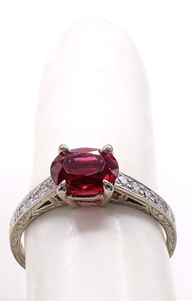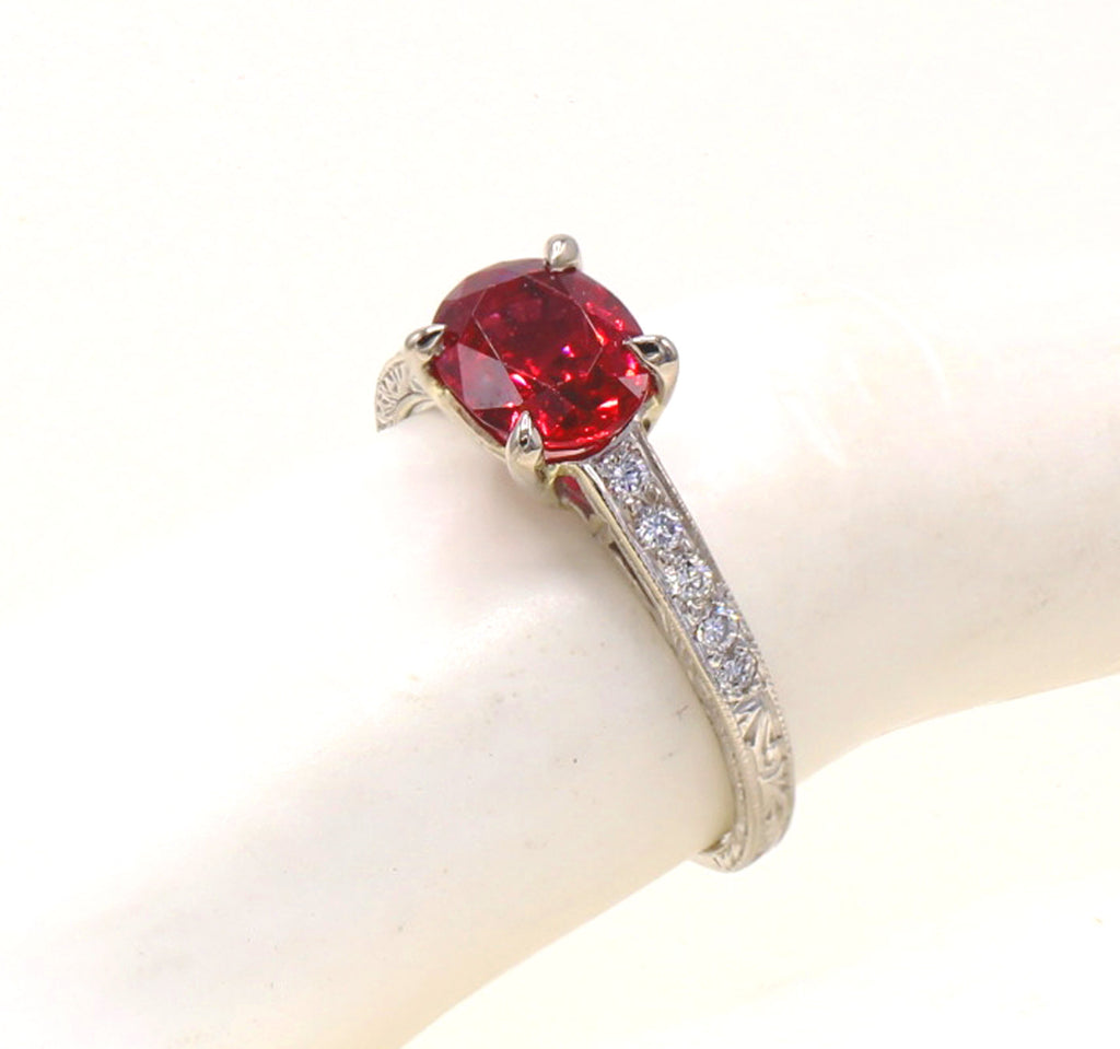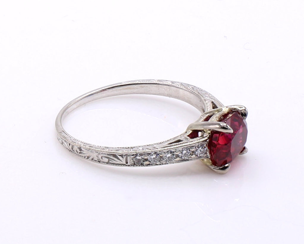 Rive Gauche JewelryA beautifully cut oval intense red spinel weighing 1.40 carats is the centerpiece of this lovely engagement ring. The red spinel has an amazing saturation of color, brilliance, life, and fire. This gem is accompanied by a report from the AGL stating that it is a Natural Spinel with no enhancement - such as heat or other means. It is set in a charming handcrafted white gold mounting with a 10-round brilliant cut set along the shanks and embellished by fine hand engraving.