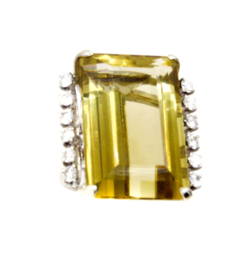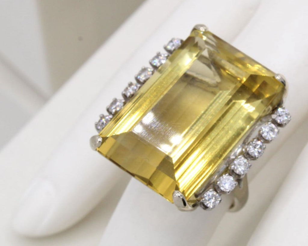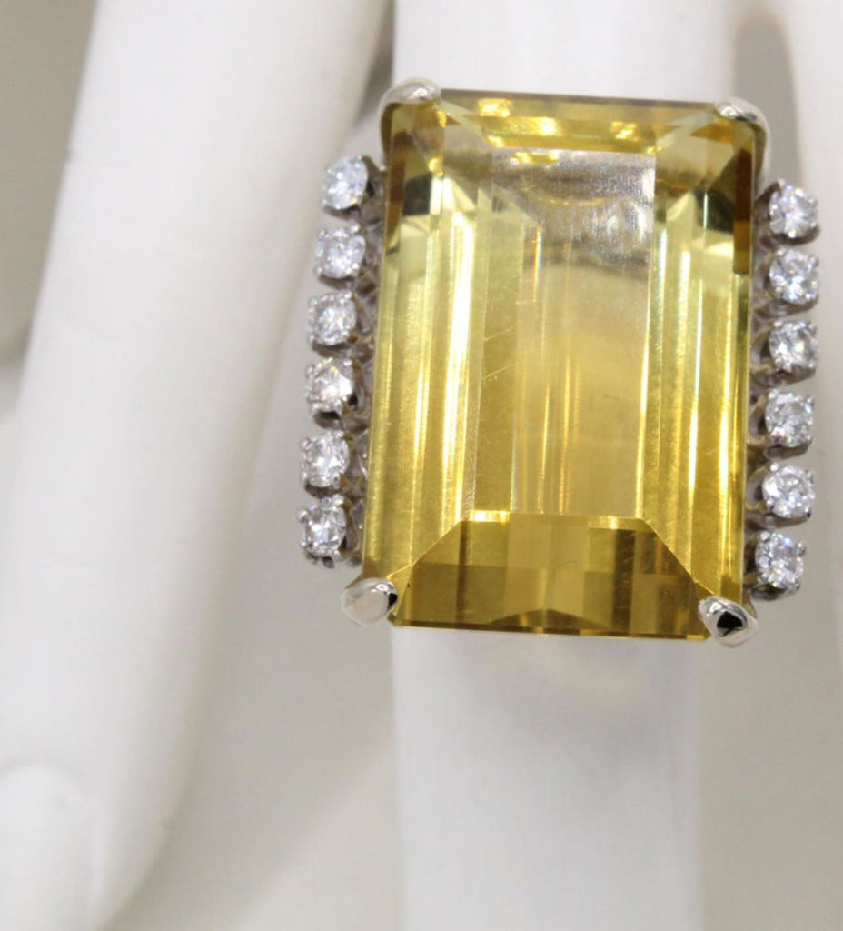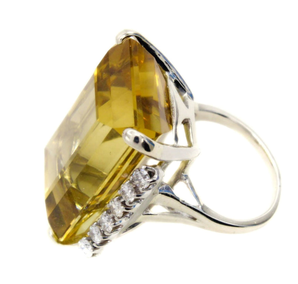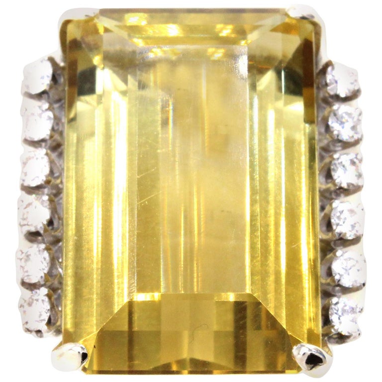 Rive Gauche JewelryCentrally set with a Golden Citrine measured to weigh approximately 35 carats this bold 1960s ring is a real eye-catcher. The perfectly cut emerald cut Citrine exhibits a beautiful saturation of color and fire. 6 bright white round brilliant cut diamonds embellish either side of the center gem with an approximate total weight of 0.8 carats.