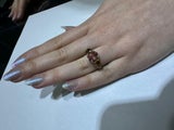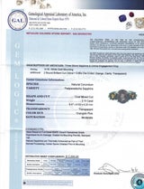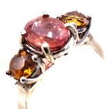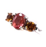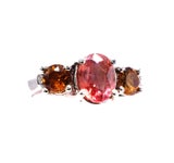 A gorgeous Padparadscha sapphire weighing 2.15 carats is the centerpiece of this colorful 3-stone ring. Padparadscha sapphires are among the rarest sapphires found, and their unique color with a distinct pinkish-orange hue makes them highly desirable. Sapphires are known to be found in all colors of the rainbow, but only the exact combination of pink and orange gems will receive the classification of Padparadscha. The name stems from the Sinhalese " padma radschen "meaning ‘aquatic lotus blossom’, These rare gems were first discovered in Sri Lanka and became well known after Princess Eugenie's choice as an engagement ring. This ring is accompanied by a gemological appraisal report from GAL (Gemmological Appraisal Laboratory of America) with an appraised value of $15,000. As we were able to purchase this ring from the inventory of a jewelry store that was closing down at a highly competitive price, we are passing this advantageous price along to our customers. The price we are offering this ring at is 50% below the appraised value. Two vibrant orange Citrines weighing 0.86 carats exhibit a beautiful contrast of colors in this handcrafted white gold three-stone mounting. Ring size is 6 and can be sized. Item Number: D3736