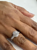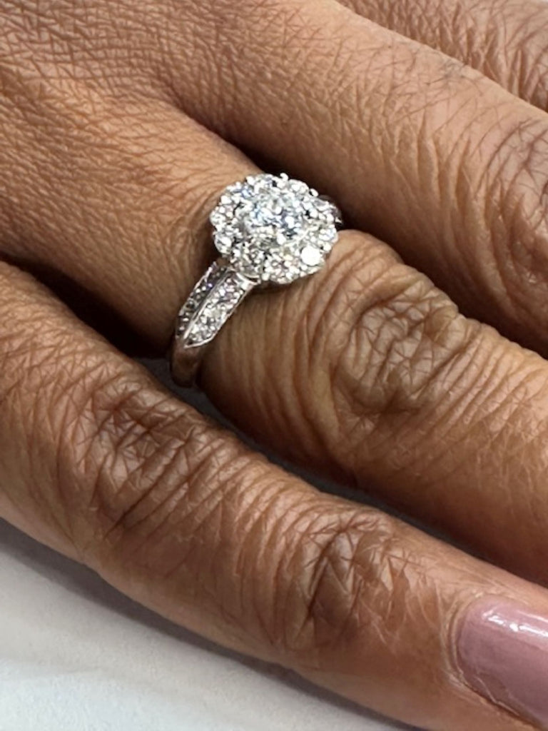Very well handcrafted platinum diamond engagement ring. Centrally set with a round brilliant cut diamond weighing 0.56 carats and surrounded by 10 round brilliant cut diamonds and 12 set down either shank, weighing a total of 0.52 carats. Average color and clarity is G VS. The weights are stamped on the inside of the shank along with Pt 900 for platinum. Ring size is 5 and can be sized.