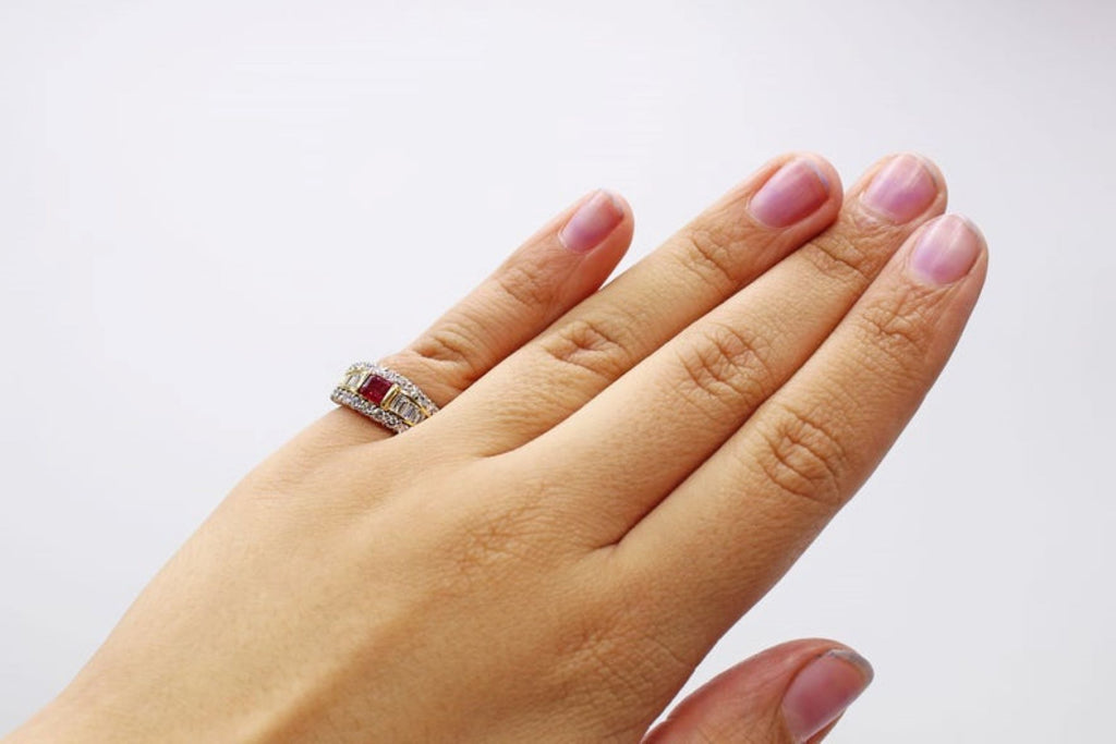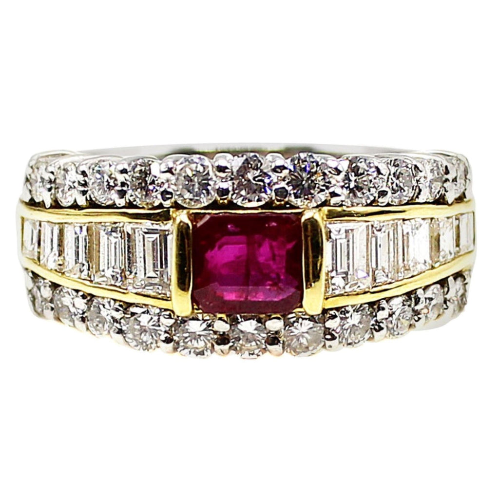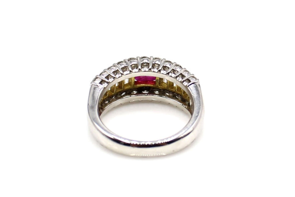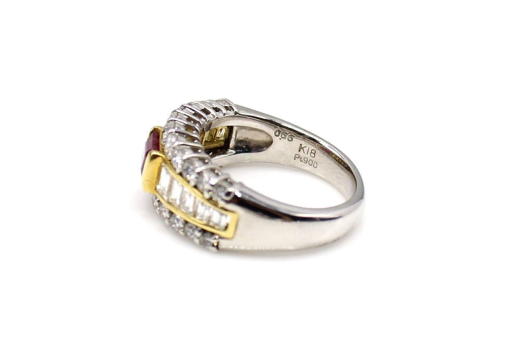 Beautifully designed and masterfully hand-crafted this ring features a centrally set square emerald cut deep red lively ruby securely held in between 2 bars of high polished 18 karat yellow gold. The ruby is embellished by 22 bright white and sparkly round brilliant cut diamonds on either side of the ring and 10 channel set bright white baguette cut diamonds set in a channel of yellow gold, with the main body of the ring worked out of platinum. The combination of colors give this most wearable ring a wonderful contrast of colors. The inside of the shank is stamped 18K and Pt 900 for platinum. The weights of the ruby 0.66 carats and the diamonds 1.34 carats are also stamped on the inside of the shank. The ring is a size 5 and can be sized within limits.