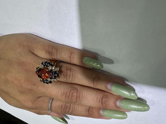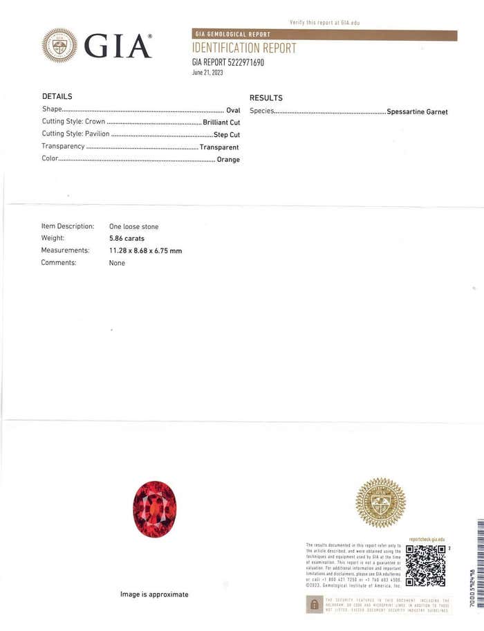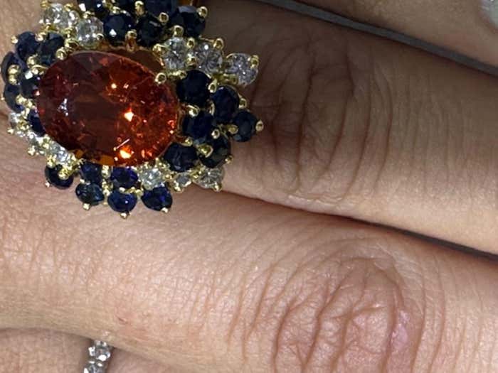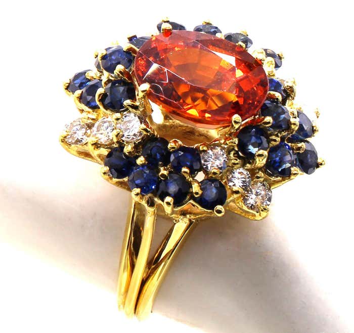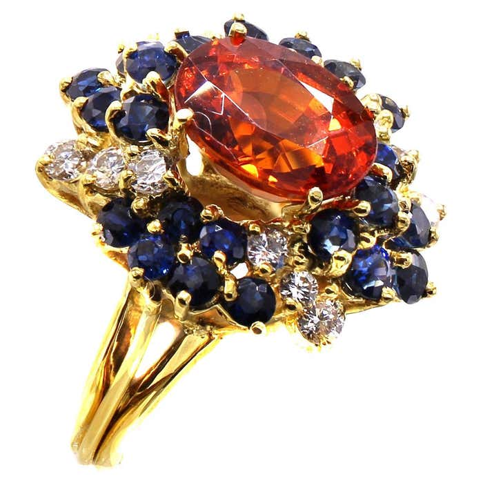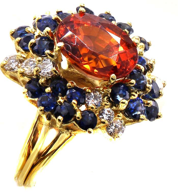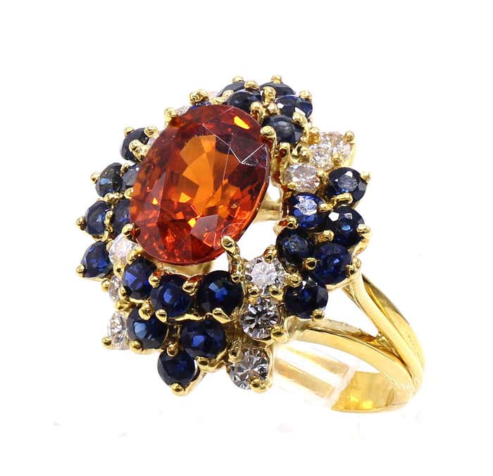Rive Gauche JewelryThe centerpiece of this beautifully designed and masterfully handcrafted 1970s ring is a gem, vivid orange Spessartine Garnet weighing 5.86 carats. This gem would also be classified as Mandarin Garnet, which refers to the rare bright orange color. Embellishing this ring are royal blue round sapphires and bright white, sparkly round brilliant-cut diamonds, all set in polished 18-karat yellow gold. The Spessartine Garnet is accompanied by a report from the Gemological Institute of America (GIA). Spessartine, also known as Spessartite garnet, is the rarest and, by far, along with Demantoids, the most valuable garnet. They are known for their vibrant, eye-catching orange. This oval is perfectly cut, displaying an exceptional brilliance and fire. The ring features an excellent contrast of colors and is a highly wearable piece of period jewelry.