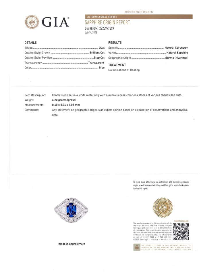 Rive Gauche JewelryThis unique Tiffany & Co. Art Deco ring from 1925 is beautifully designed and amazingly hand-crafted to the high standards of early Tiffany jewelry. Featuring an oval sapphire approximately 2 carats in weight, with a gorgeous, deeply saturated blue and wonderful brilliance , flanked by two bright white triangular cut diamonds and embellished by numerous smaller Old European cut diamonds, all set in platinum. Beautiful milligrain work and fine engraving give this wonderful ring its' finishing touches. The sapphire is accompanied by a report from the GIA that the origin of the sapphire is Burma, and there are no indications of enhancement by heat - which makes this ring even rarer. A truly precious, collectible, and wearable piece of period jewelry. Signed on the inside of the shank Tiffany & Co