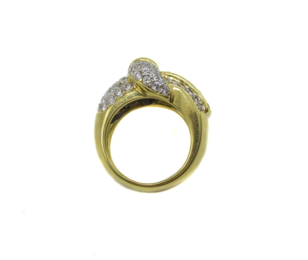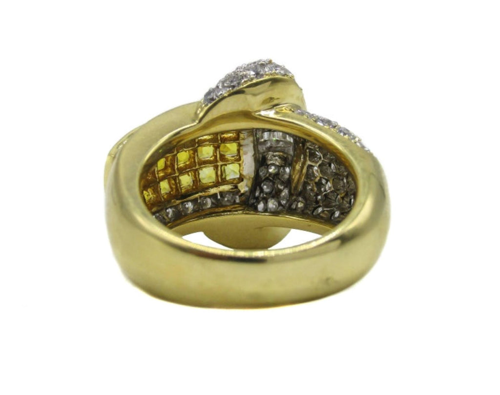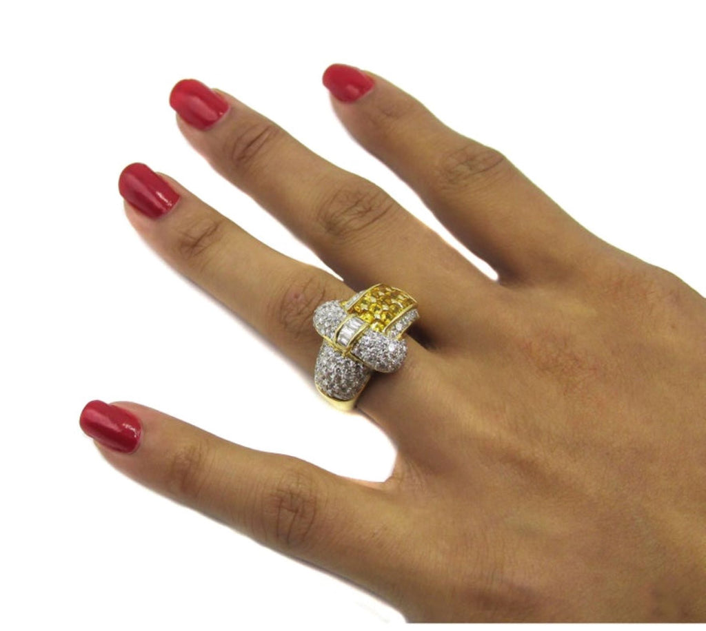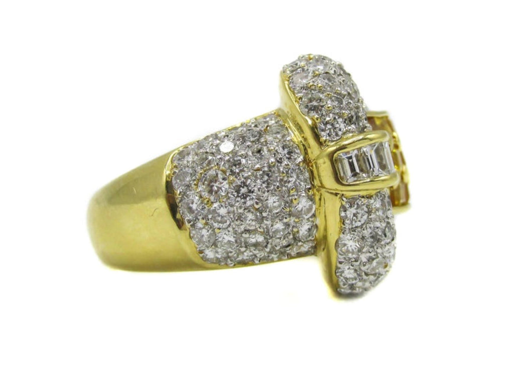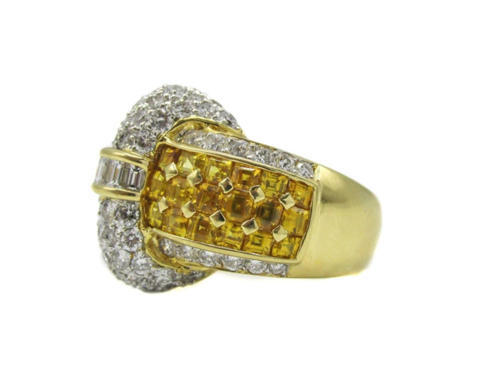 Rive Gauche JewelryStunning 18 karat yellow gold diamond and yellow sapphire ring designed as a belt buckle. This amazingly crafted ring is pave set with 79 round brilliant cut diamonds and 4 channel set baguette cut diamonds. 18 vivid orangey yellow square emerald cut sapphires are meticulously set in channels and beads of gold. The ring size is now 6 and can be sized.
