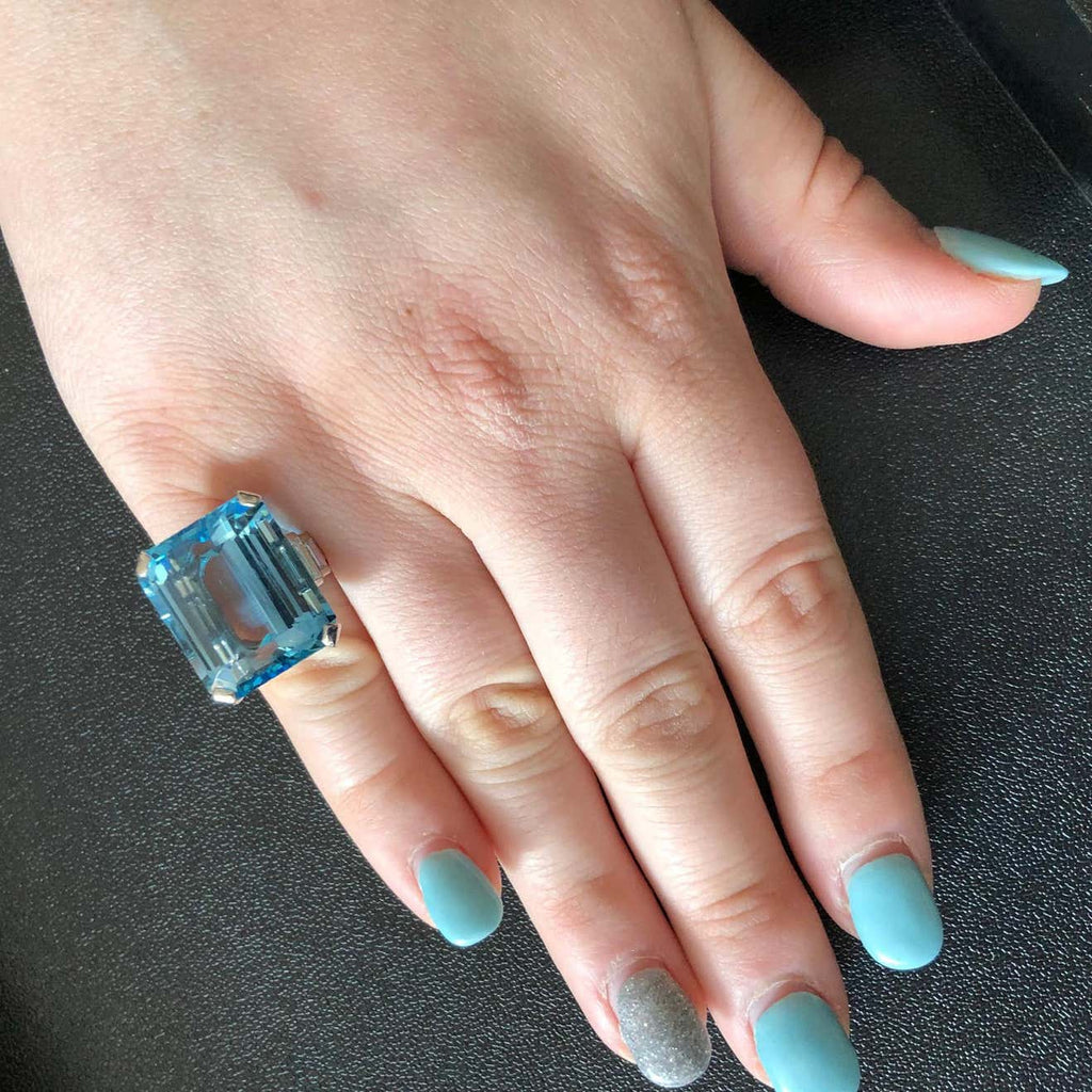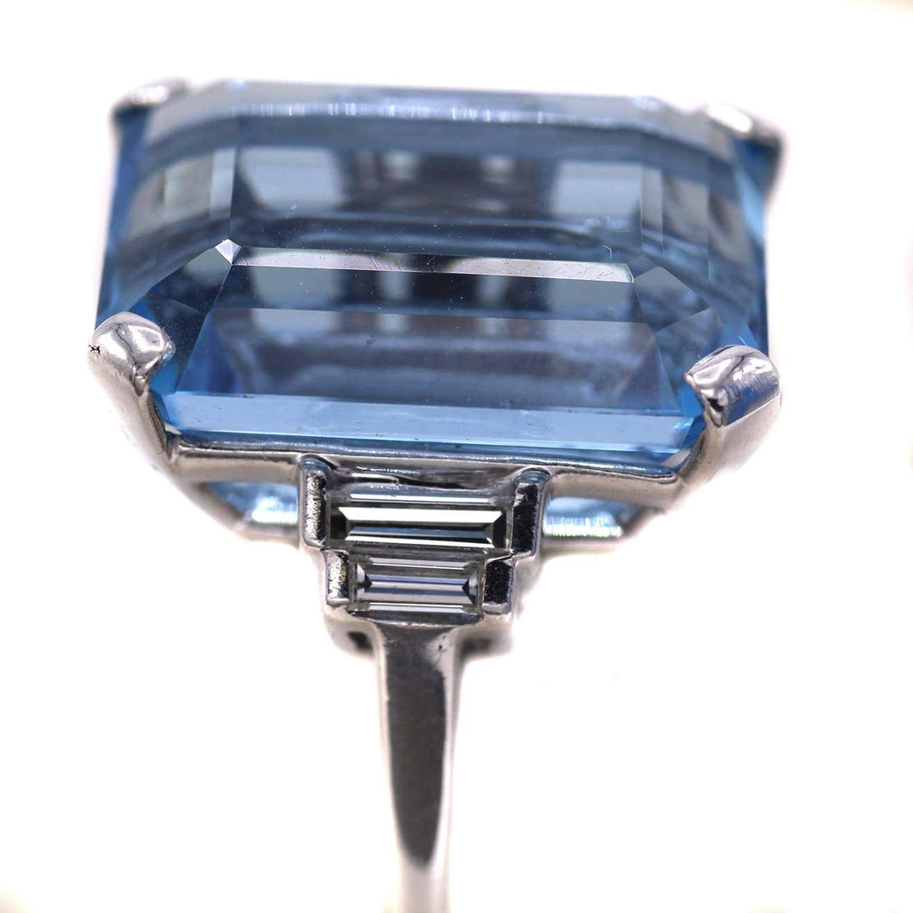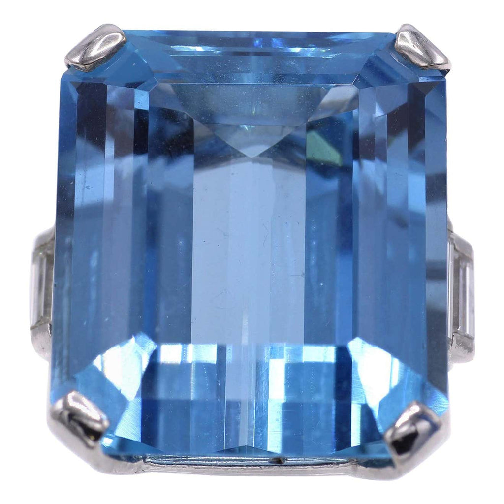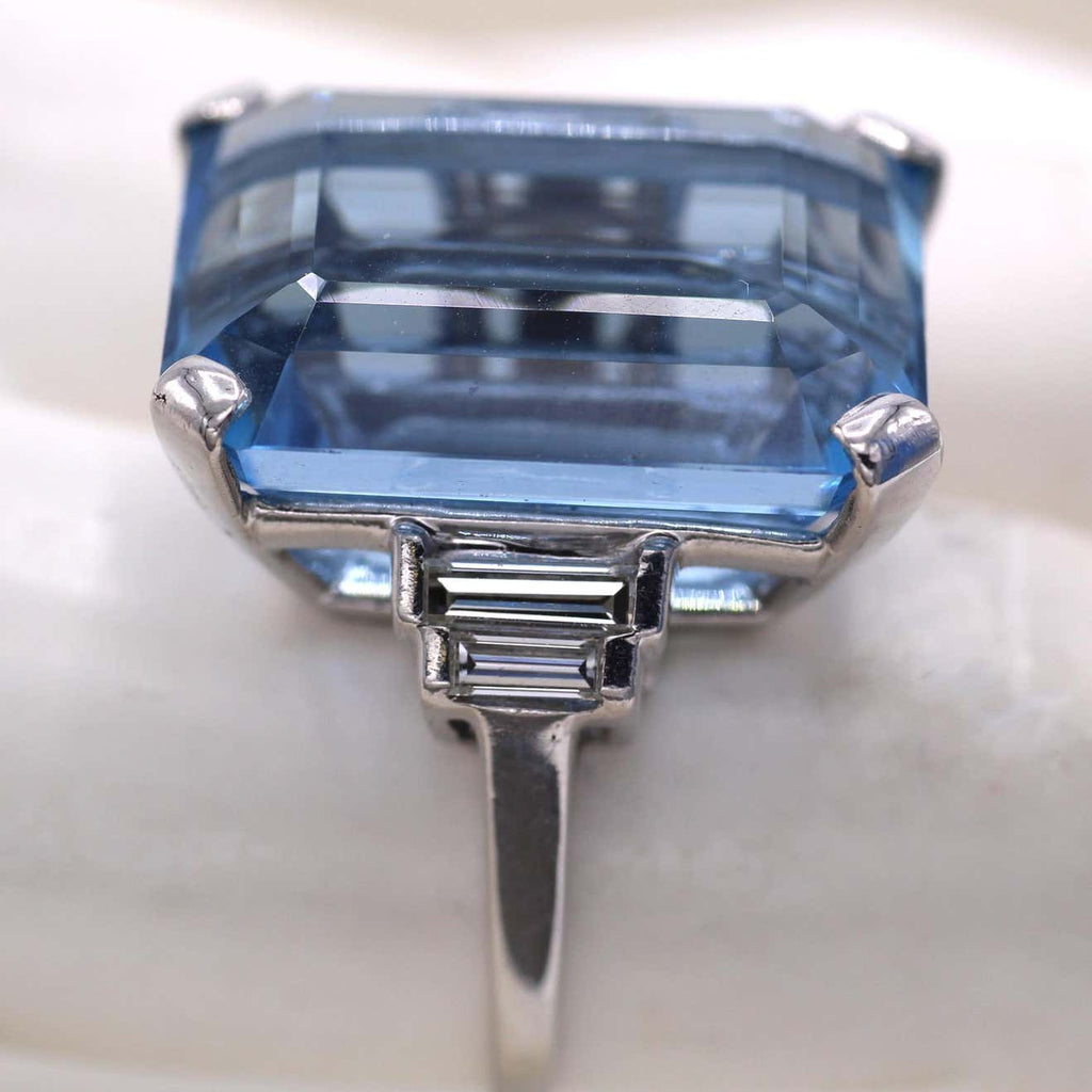 An amazing Santa Maria color aquamarine weighing 27.02 carats is the center piece of this gorgeous Art Deco ring. The perfectly cut rectangular step-cut aquamarine has an incredible saturation of color and brilliance. 2 bright white baguette cut diamonds embellish either side of the shanks and the geometrical design of this platinum ring from ca 1935 make this ring a special period piece of jewelry and a most wearable ring.