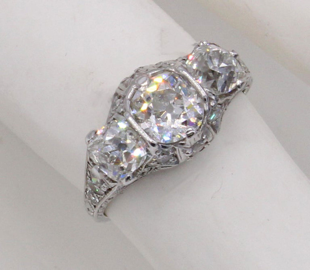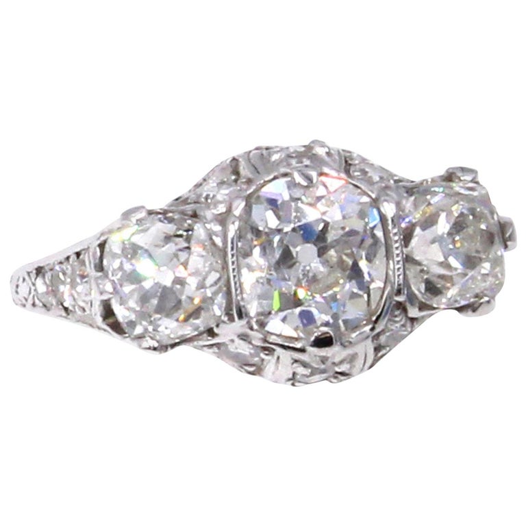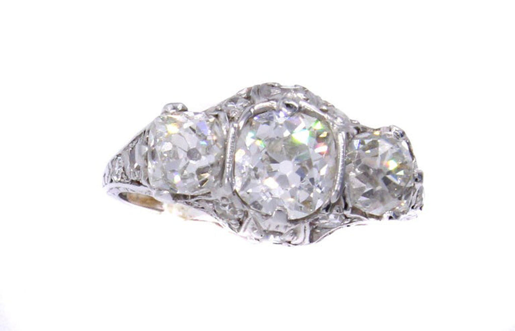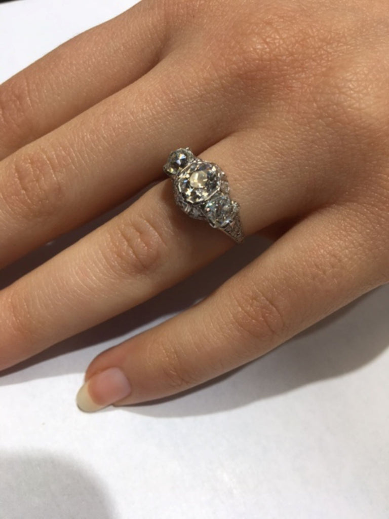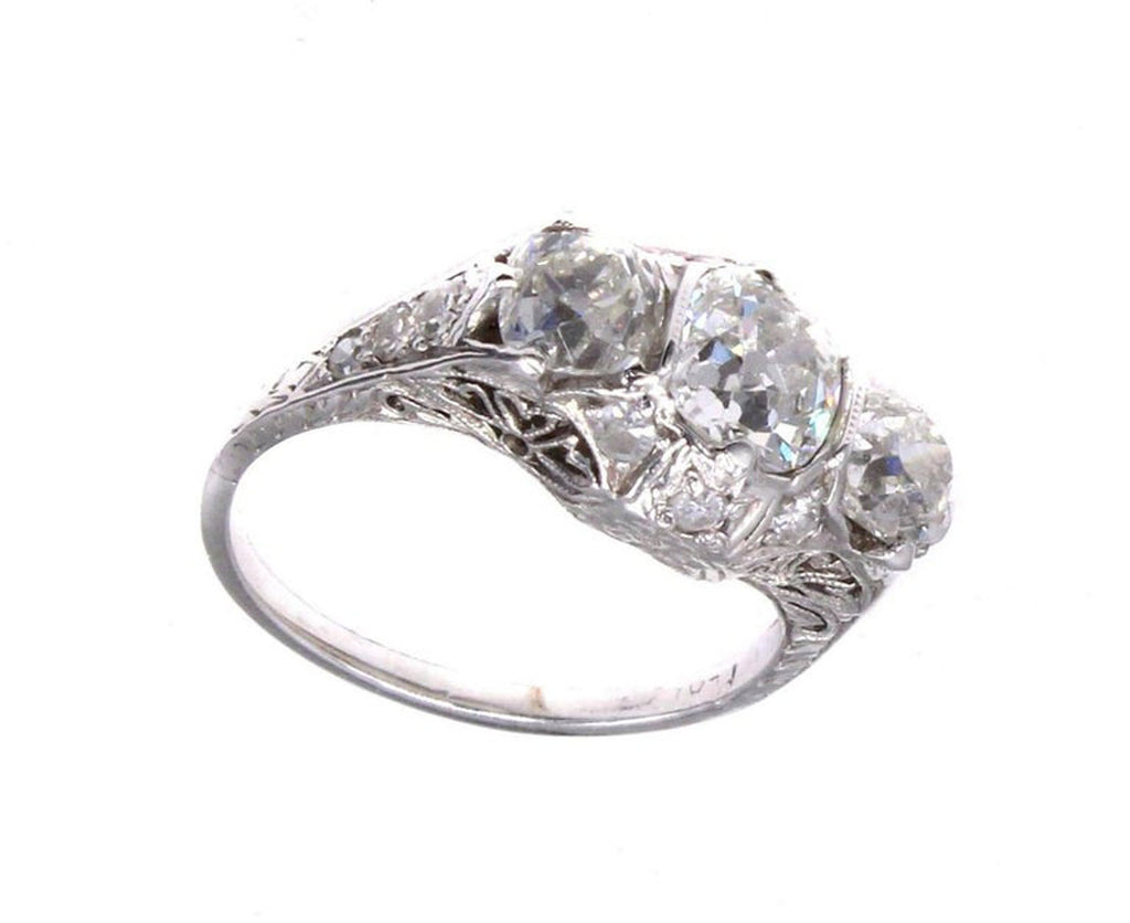 Rive Gauche JewelryBeautifully designed and masterfully hand-crafted in platinum this Edwardian three stone ring from ca 1915 exhibits an amazing detail of ajoure work and hand engraving throughout the entire ring. Centrally set is an antique cushion cut diamond measured to weigh approximately 1.05 carats flanked by 2 cushions measured to weigh approximately 0,55 carats each. The 3 old cut diamonds exhibit an amazing amount of fire and brilliance bringing this beautiful period ring to life.