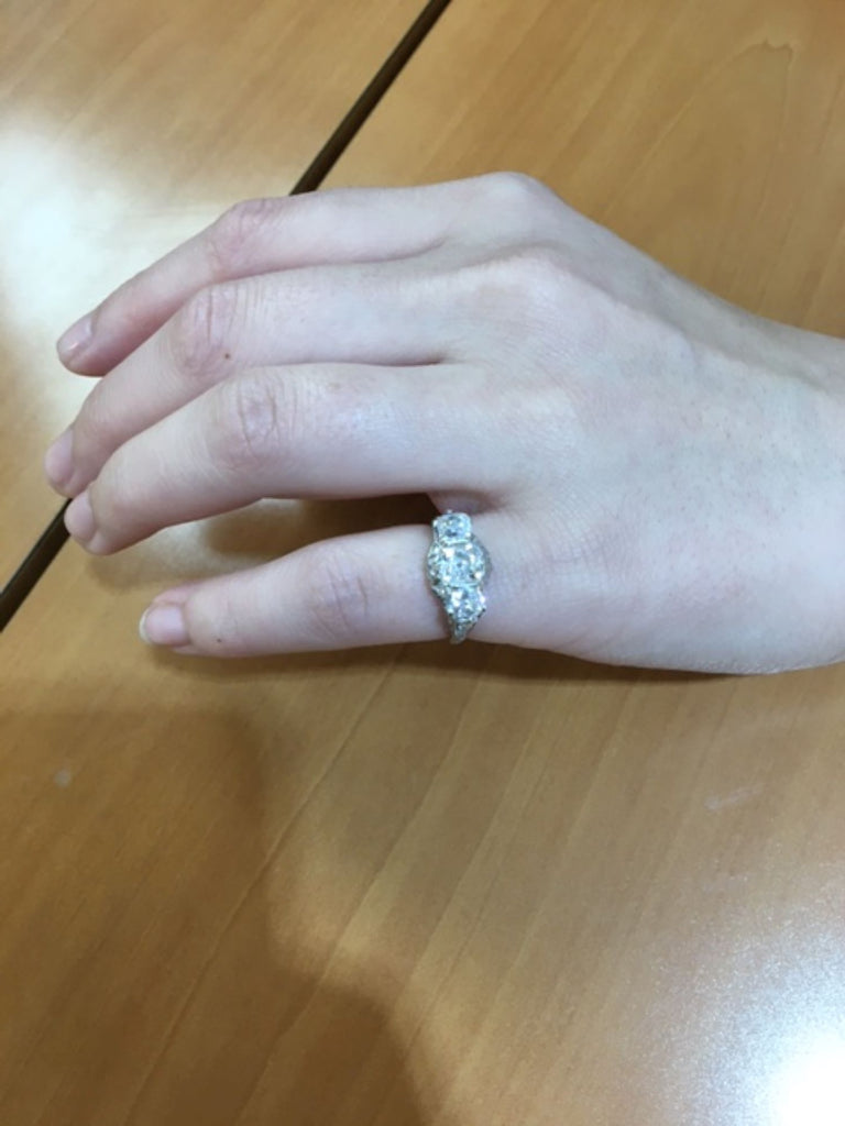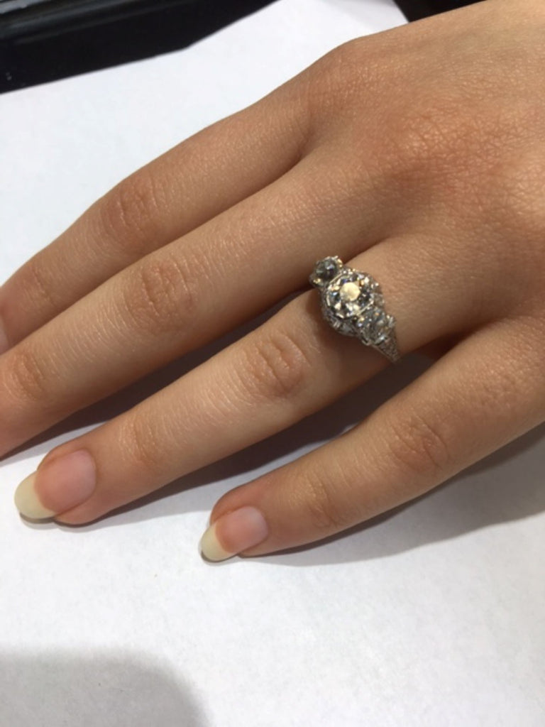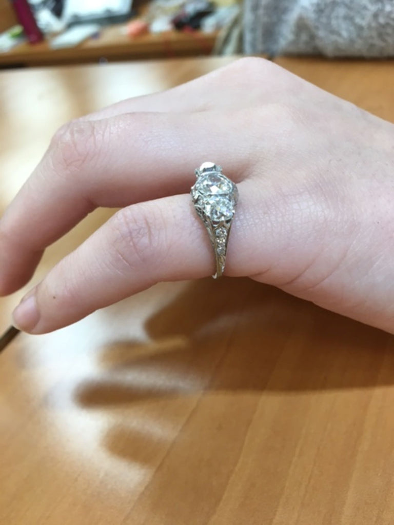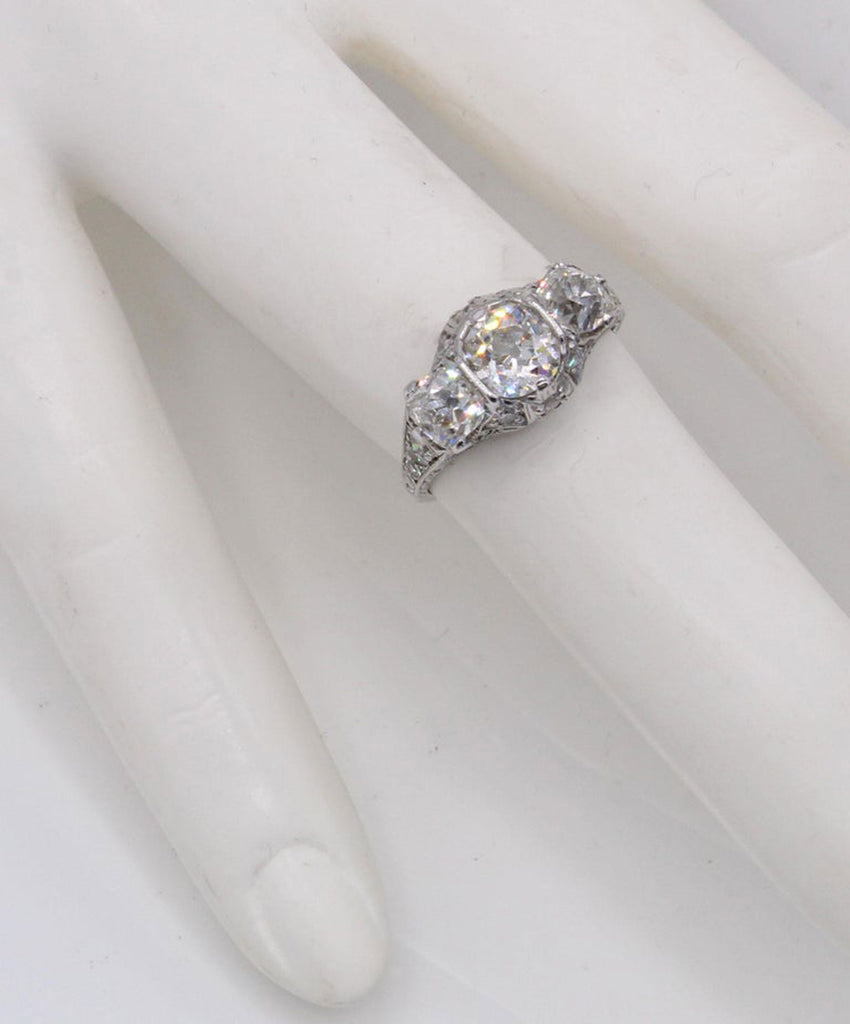 Rive Gauche JewelryBeautifully designed and masterfully hand-crafted in platinum this Edwardian three stone ring from ca 1915 exhibits an amazing detail of ajoure work and hand engraving throughout the entire ring. Centrally set is an antique cushion cut diamond measured to weigh approximately 1.05 carats flanked by 2 cushions measured to weigh approximately 0,55 carats each. The 3 old cut diamonds exhibit an amazing amount of fire and brilliance bringing this beautiful period ring to life.