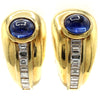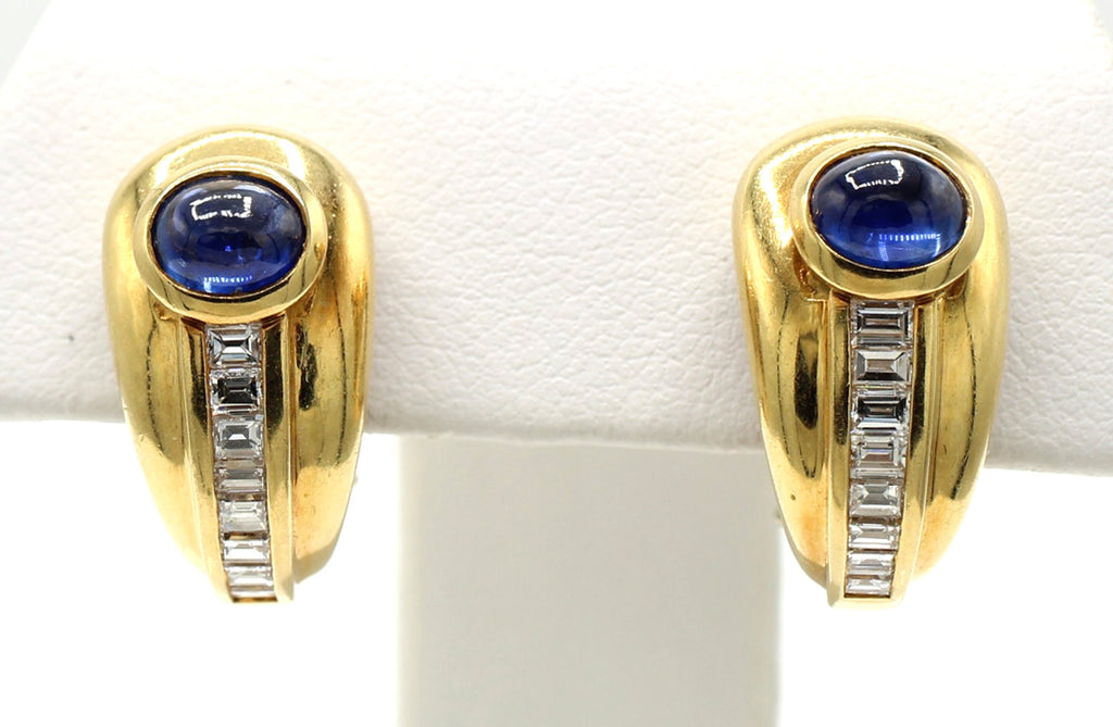 Fun and colorful 18 karat yellow gold hoop earrings set with a navy blue cabochon sapphire in each earring, complemented by 8 bright white, sparkly baguette-cut diamonds. Length 0.75 inches